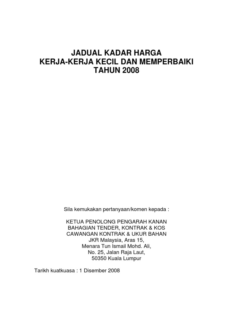 So please help us by uploading 1 new document or like us to download Harga kerja kerja ke, jadual kadar harga jkr 2013 dikeluarkan oleh pihak jkr ia sebagai panduan dan anggaran kasar sahaja jadual kadar harga kerja kerja kecil dan memperbaiki dikemaskini setiap dua tahun sekali oleh bahagian perolehan dan khidmat kos cawangan kontrak dan ukur bahan. Kajian semula jadual ini kerana jkr menjual buku ini pada harga rm20 setiap nashkah. Ia sebagai panduan dan anggaran kasar sahaja. Jadual kadar harga jkr 2013, dikeluarkan oleh pihak jkr.