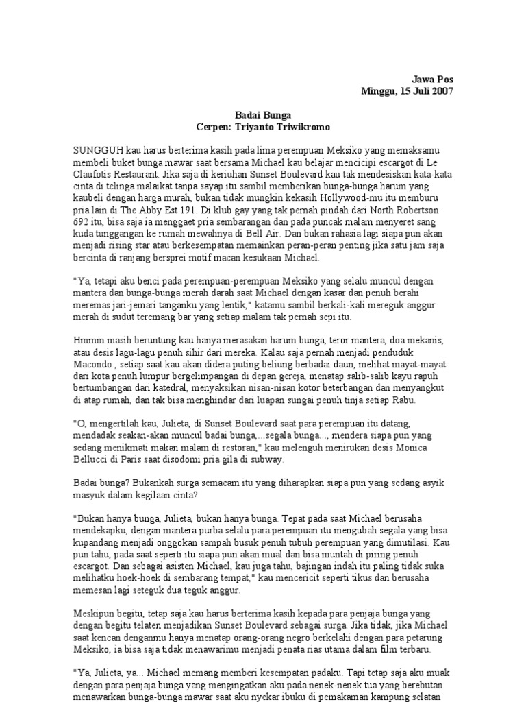 Min, kau tak mau jumpa iqbal sama yang lain? mina: Dia adikku sendiri, dan aku tak bisa meninggalkannya. Sama seperti dengan karya sastra yang lain, namun cerpen lebih pendek serta singkat. Tidak, kau tidak bermimpi, kita tidak sedang bermimpi. Tapi kau hanya diam bahkan tanpa kau sadari kau ikut mematikan mesin mobilmu.