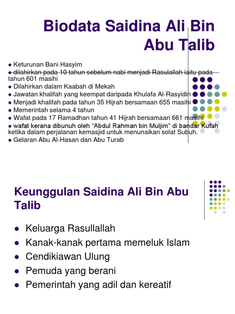 Keturunan bani hasyim & sepupu rasulullah 3. Ali bin abu talib bin abdul mutalib. Home > penerang hati > saidina ali bin abi thalib. 1 0 tahun sebelum nabi menjadi rasul 601 masihi. Selepas mengahwini puteri rasulullah s.a.w. Holy imam karim al huseyni aga khan sites the words of hazrat ali ibn abi talib(a). Kisah 5 karomah sayyidina ali bin abi thalib salah satu keistimewaan ali bin abi thalib adalah beliau merupakan orang kedua. Tugasan mata pelajaran sirah tahun 6sekolah rendah agama taman sri andalasdisediakan oleh : Namun, temyata ali bin abi thalib yang mendapat kehormatan itu serta mampu menghancurkan benteng khaibar dan berhasil membunuh seorang prajurit musuh yang berani bernama marhab lalu. Ali bin abi talib bin abdul mutalib. Sayyidina ali dilahirkan di makkah pada tahun 601. Khalifah ali bin abi talib. Selepas mengahwini puteri rasulullah s.a.w.