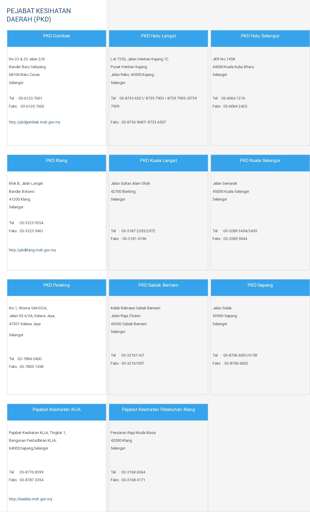 Pejabat kesihatan daerah sabak bernam 26 jalan menteri, 45300 sungai besar, selangor, malaysia. Jabatan perkhidmatan kesihatan dan persekitaran. Pejabat kesihatan daerah sepang jalan salak 43900 sepang selangor tel: Pejabat pendidikan daerah sabak bernam ; Pegawai kesihatan pejabat kesihatan daerah 45300 sungai besar. Alamat emel ini dilindungi dari spambot. Pejabat kesihatan lapangan terbang antarabangsa tkt.1, bangunan pentadbiran klia 64000 sepang selangor tel: Pejabat pergigian sungai besar 45300 sungai besar selangor darul ehsan. Mohamad yussof bin daud penolong pegawai perubatan kanan. Pejabat kesihatan daerah sabak bernam kompleks pejabat kerajaan 45300 sungai besar selangor tel: Pejabat kesihatan daerah sabak bernam; Sabak bernam hospital tengku ampuan jemaah jumlah klinik kerajaan di selangor adalah sebanyak 271 buah dan pecahan mengikut daerah adalah seperti di lampiran 1 manakala jumlah hospital swasta adalah sebanyak 55 buah dan jumlah klinik swasta adalah sebanyak 1979 buah seperti yang dinyatakan pada lampiran 2. Terdahulu, operasi bersepadu itu turut disertai pejabat daerah dan tanah sabak bernam, pejabat kesihatan daerah sabak bernam, ibu pejabat polis daerah (ipd) sabak bernam, anggota sukarelawan jabatan sukarelawan malaysia (rela) dan jabatan kerja raya (jkr) sabak bernam.