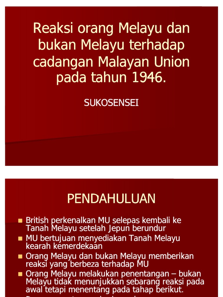 Bab 2 Malayan Union Dan Persekutuan Tanah Melayu from slidetodoc.com Check spelling or type a new query. We did not find results for: Penentangan orang melayu terhadap malayan union. Maybe you would like to learn more about one of these?